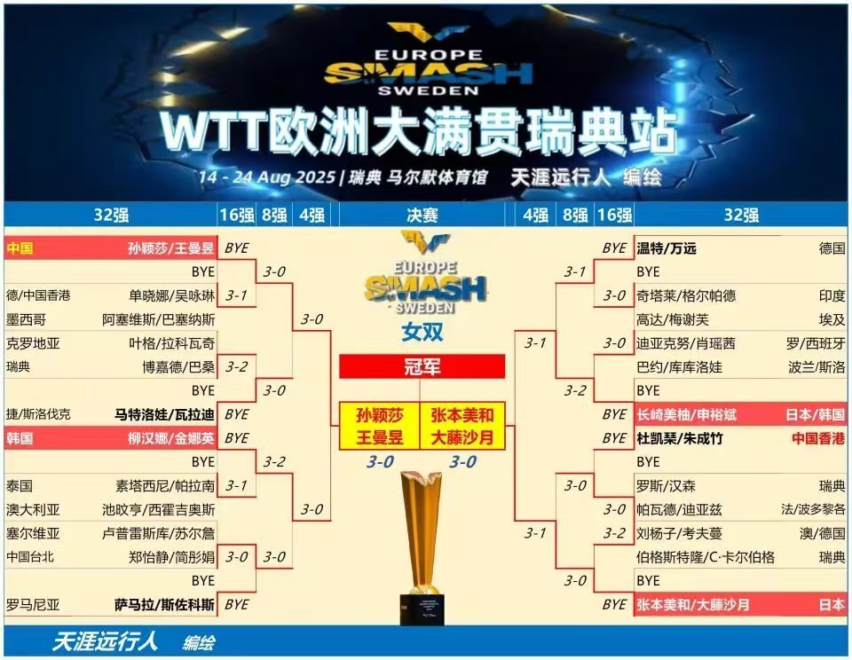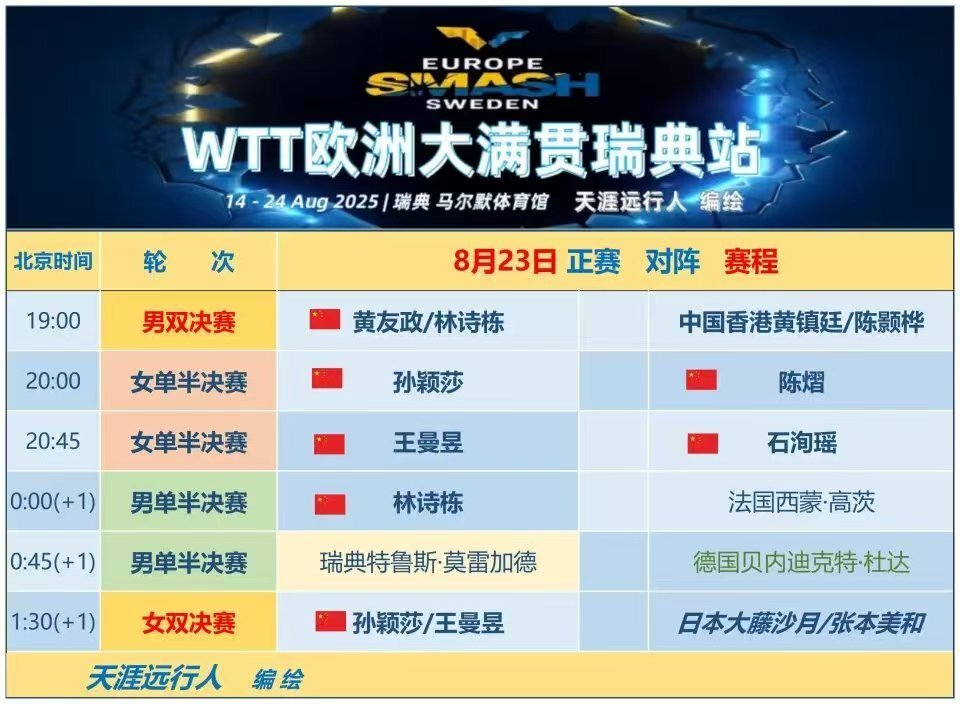 WTT欧洲大满贯瑞典站丨8月23日全日赛程+观战指南