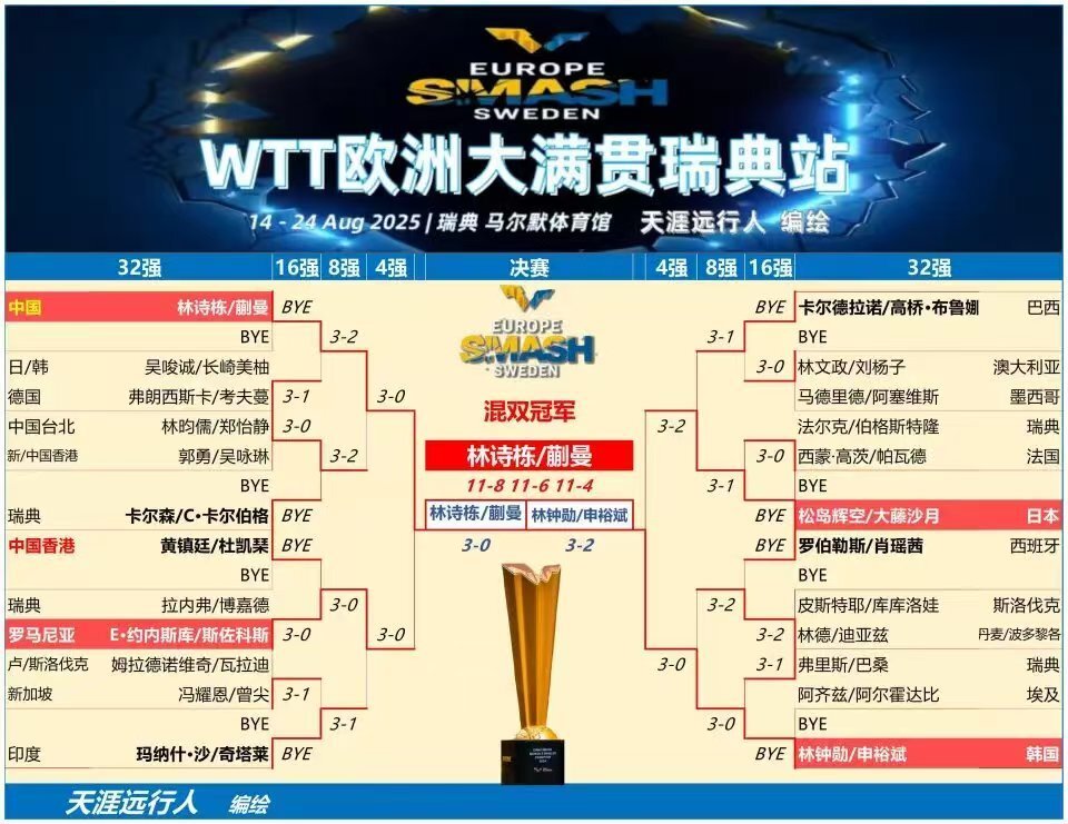 瑞典大满贯混双夺冠,女单包揽4强林诗栋冲3金
