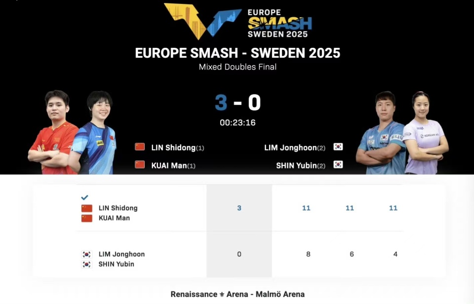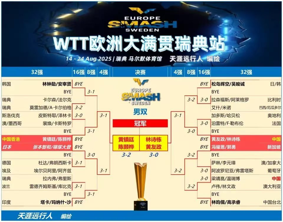 中国组合林诗栋/蒯曼以3-0横扫韩国强档林钟勋/申裕斌,获得欧洲大满贯瑞典站冠军。
